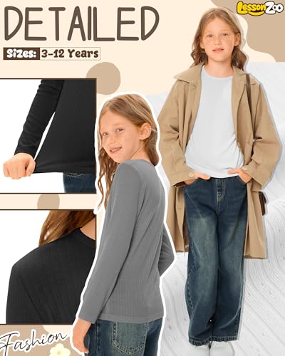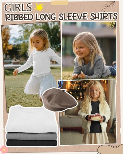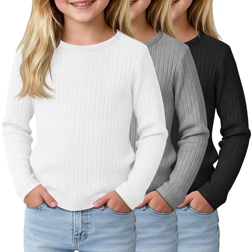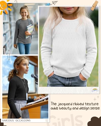 3 Pack Girls Ribbed Long Sleeve Shirts, Cotton Crew Neck Jacquard Tops Kids Casual Layer Knit Basic Tees 3-12 Years