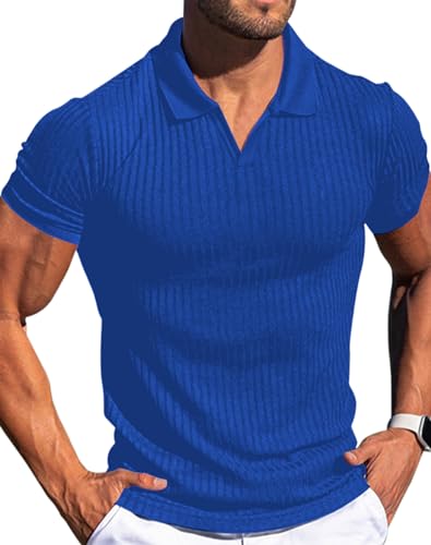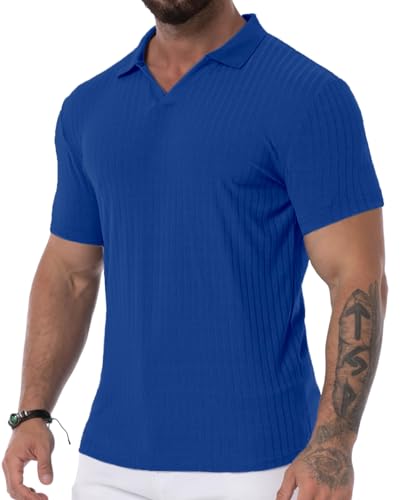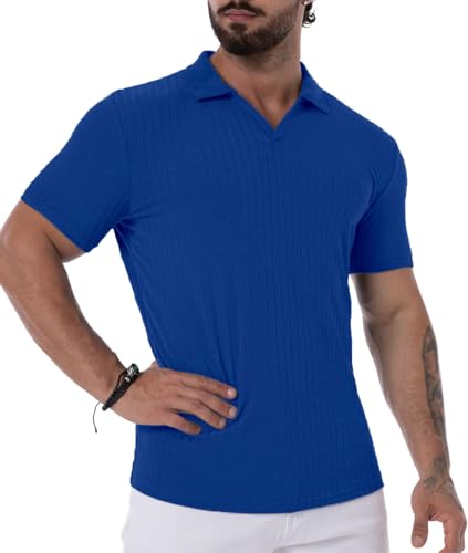 Men’s Collared Muscle Polo Shirts Slim Fit Short Sleeve V Neck T Shirts Men Zipper Ribbed Golf Shirt Casual Stylish