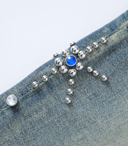 These denim pant are made of 98% cotton, 2% spandex stretch fabric, featuring a skinny fit with vintage wash that exudes an edgy vibe. It is adorned with sparkling rhinestone embellishments, which add a glamorous, eye-catching touch. These rhinestone jeans design combines retro denim aesthetics with modern, flashy details, making it a standout piece for fashion-forward outfits.