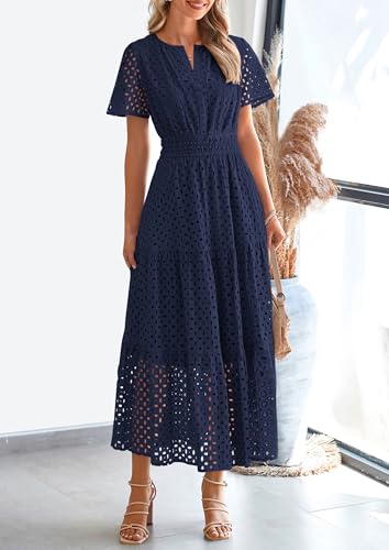 Specification: PRETTYGARDEN Womens 2026 Summer Maxi Dress Short Sleeve V Neck Hollow Out Eyelet A Line Long Flowy Beach Vacation Dresses