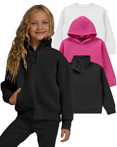 Pure champ Girls Sweatshirt 3 Pack includes a fleece hoodie for teen girls, a classic crewneck sweatshirt, and a quarter zip pullover hoodie. three versatile essentials for school, sports, travel, and everyday wear, in sizes XS–XL (4/5–14/16). This value set delivers cozy comfort, trendy style, and year-round practicality for little girls, youth girls, and teens. Crafted from 100% polyester super-soft fleece with 4-way stretch, these girls sweatshirts move with her while keeping their shape. The anti-pilling, zero-shrinkage fabric ensures they stay looking new wash after wash, giving parents durable and dependable girls clothes that last. Each style features thoughtful details: a kangaroo pocket on the hoodie, slip-in side pockets on the zip up hoodie girls style, and rib-knit cuffs and hems for fit retention. The relaxed drop-shoulder fit makes layering easy, while the quarter-zip stand collar helps block out the chill. Available in a variety of colors like pink, lilac, sage, sky blue, black, beige, and brown, this set blends into tween girls trendy clothes collections and works perfectly as kids fall clothes, school outfits, or everyday layering pieces. Whether she’s headed back to school, lounging at home, or exploring outdoors, this girls sweatshirt set is a cozy, stylish, and practical choice for every season.
