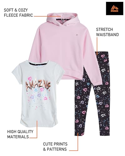 RBX Girls Pants Set – 3 Piece Soft Fleece Pullover Hoodie Short Sleeve Shirt Graphic Tees and Leggings for Girls