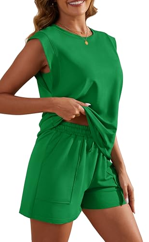 Specification: RUBZOOF Two Piece Sets for Women Summer Cap Sleeve Lounge Short Sets Crewneck Outfits with Pocket