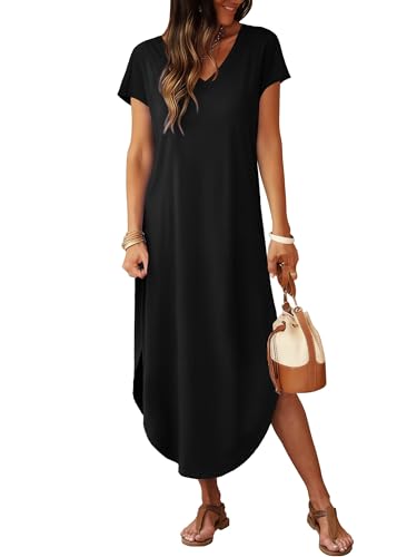 RUMIA Summer Casual Maxi Dresses for Women- Women’s V Neck Cap Sleeve Long Sundress with Pockets Beach Vacation