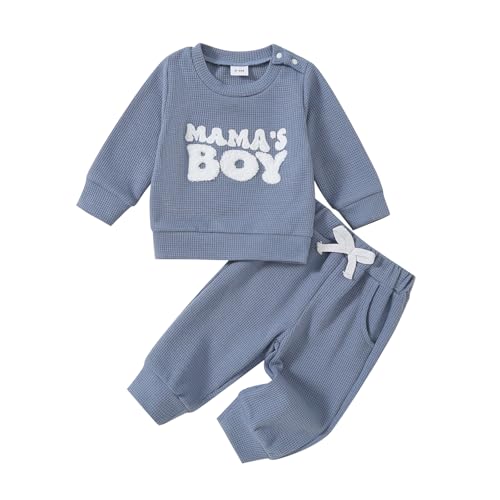 Toddler Baby Boy Fall Winter Clothes Waffle Knit Long Sleeve Sweatshirt Pants Set MAMA’S BOY Embroiderey Outfit Set