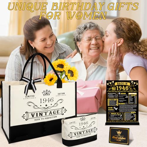 YeohJoy 80th Birthday Gifts for Women Canvas Tote Bag Travel Gear, Unique 80 Years Old Birthday Gifts for Mom Wife Aunt Friends Her, Vintage 1946 Handbag & Cosmetic Bag & Back in 1946 Poster